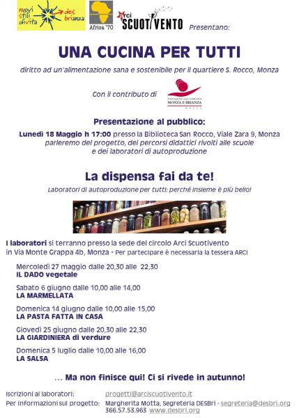 Il progetto ha lo scopo di favorire l'accesso al cibo (sano e di qualità) ai cosiddetti "nuovi poveri" (nuclei familiari vulnerabili e marginali residenti nel quartiere San Rocco di Monza) che non si rivolgono ai tradizionali canali di aiuto (mense dei poveri, collette alimentari) e includerli in attività e percorsi di sostegno che si concretizzino attorno ad un luogo (il circolo Arci Scuotivento). La cucina diventa un'occasione per riunire una comunità.